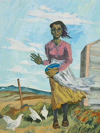 Freed in 1945, he returned to a more receptive Calgary, where he met fellow modernists Janet Mitchell, Jim and Marion Nicoll and Jock Macdonald. Macdonald established them as the Calgary Group, adding Luke Lindoe and others to the mix. Canadian Art Galleries, Calgary’s first commercial venue, would give Bates solo shows in 1947 and 1948. His work, in which he used altered perspectives, quirky, unusual plays of colour, multiple planes of space, broken up form and dissembled objects focused on Canadian images of Alberta landscapes, working class and farm people, family scenes, social scenes, and still life.