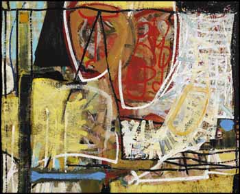 Town worked in a variety of media – painting, printmaking, assemblage and collage. Collage was said to be at the heart of his work, and David Burnett wrote that they were “a complex, multi-directional interweaving of technique, materials, experience and expression.” He rocketed to prominence in the 1950s, creating an explosion of innovative work in many different series. He achieved considerable recognition for his autographic prints, a series of monoprint works produced between 1953 and 1959. Widely appreciated nationally, their reputation spread internationally as they received awards in Yugoslavia, Chile and New York. In 1958 he was awarded what was the largest public art commission to that date in Canada – a 10 by 37 foot mural for a hydroelectric dam at Cornwall, which inaugurated the St. Lawrence Seaway. Between 1957 and 1964, he had 15 solo exhibitions – in Toronto, Montreal, Regina, Vancouver, New York and New Jersey, and his work was included in about 70 group exhibitions in Canada and internationally. He was known for his inventive imagery, expressionist brushwork and his control over his painterly images, which engaged in a push-pull of dynamic tension across his surfaces.