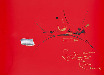 A self-taught painter and theorist, Georges Mathieu is recognized as the founder of Lyrical Abstraction and best known for his largescale paintings with curving calligraphic lines and rhythmic quality. In his published manifestos, Mathieu outlines the philosophy of Lyrical Abstraction, highlighting the dominance of speed, intuitive expression and a euphoric state of mind, which is central to the creation of his art. Squeezing the paint directly from the tube onto the canvas, he emphasized the necessity of rapid execution and often displayed his expression in public performances by speedily creating paintings before live audiences, while dressed in costume. These performative acts, which he merged with his paintings, anticipated the oeuvres of many other artists of the 1950s and 60s. Mathieu also experimented with different mediums, making his first prodigious sculptures in 1962. A colourful character and renowned artist, Mathieu exhibited in Paris and internationally, notably in a solo exhibition at Galerie Drouin, Paris, and at the Stable Gallery and Kootz Gallery in New York. His work is held in prominent private and public collections, including the Guggenheim in New York and the Art Institute of Chicago, among others.
