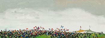 Bobak was a master at depicting scenes of crowd-filled streets, and her work is unique in capturing the joyous celebration of the end of World War II. Upon her return to Vancouver, she took a teaching post at the Vancouver School of Art, where she taught painting until 1950. By this time she had married fellow war artist Bruno Bobak, and they had a son, Alexander. She continued to teach and paint in Vancouver, turning her attention to beaches and the city, and she was especially interested in parades, celebrations and scenes of joyous, shared city life. In 1960 the Bobaks, by then a family of four - moved to Fredericton, New Brunswick, where she continued to teach and explore animated cityscapes in her paintings. She taught at the University of New Brunswick and in many other institutions in Canada throughout her life as a sessional and guest instructor. She is fondly remembered by her students, who noted her respect for their ideas and their own personal manner of engaging with art. Bobak explored Fredericton by bus and on foot, feeling more engaged with people this way. She was especially fond of pubs, sporting events, parades and marches, where she found subjects who were happy to stay put for a time so that she could sketch their shared camaraderie. She produced lithographs, having mastered this technique during her time overseas in London, and is also known for her floral still lifes, delicate renditions of wildflowers and grasses that are sensitively handled, and which to her, have much in common with her depictions of large groups of people. "Poppies are like crowds," she told the CBC in 1943, "you don't organize them."