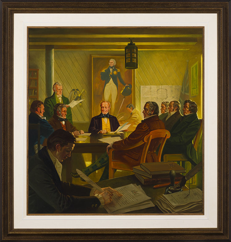 This painting, classically arranged by Charles Comfort, is an example of the Hudson’s Bay Company calendar serving to reinforce an idealized image of strength and authority tied to the Company’s colonial presence. The setting is Norway House, the most important trading post in the interior of Rupert’s Land. The annual councils, largely comprised of the governor and the various chief factors of the trading posts, would meet here rather than the more northerly York Factory beginning in the 1830s. Here, Governor George Simpson is flanked by the commissioned officers of the committee, while two clerks dutifully record the decisions. Above them, a higher authority still, is Lord Horatio Nelson, Rear Admiral of the Royal Navy, in a portrait by William von Moll Berczy (lot 22 in this sale)—a reminder of the ultimate imperial hierarchy within which the Company operated.