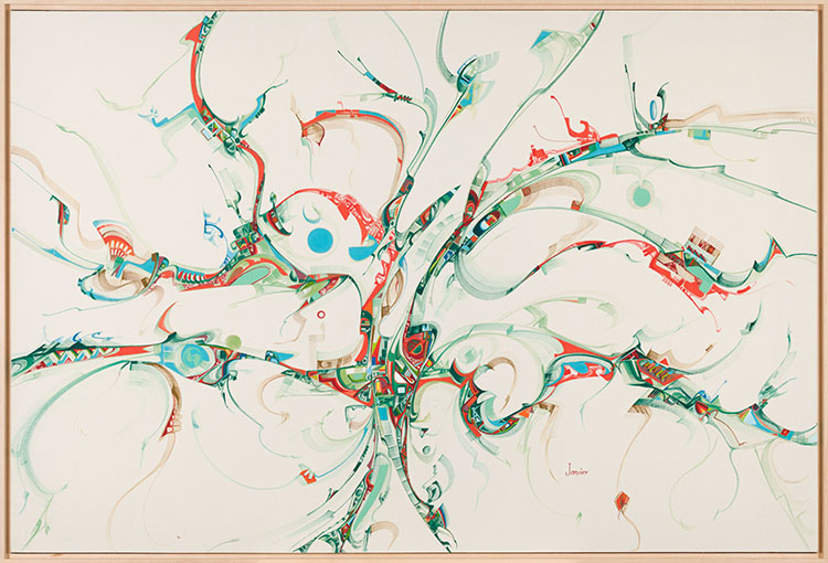 Exodus from the Soil is an impressively scaled and intricately detailed canvas by Dënesuline artist Alex Janvier, completed in 1978. A warm white background serves as a spare field for Janvier’s wildly experimental and iconic brushed designs that were at the core of his more than 70-year career. With Exodus, Janvier has deviated from his strictly hard-edged paint application to include lightly brushed calligraphic strokes, like those typically used in underpainting while developing a canvas’s composition. Vine-like wisps burst outwards from the centre of the canvas like new growth searching for sunshine, water and support, forming an armature for Janvier’s harder, denser designs that cluster inside the connected systems in tones of cyan, orange and green.