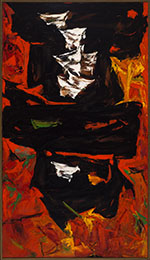 Les entrailles de Prométhée is an exceptional example from Letendre’s oeuvre that embodies the restless energy and operatic ambition of her most innovative period. In the vertically oriented composition, fiery mixtures of red and orange with flecks of green surround a primordial black ground, encroaching on or being subsumed by the central void. White swipes of paint seem to float above the tar-like areas on the central axis, like flakes of ash tossing in gusts of hot air above a gaping volcanic crater. Letendre typically added titles after completing her paintings, and she associated this work with the Greek myth of Prometheus, a Titan punished by the gods of Athens for bringing fire, technology and civilization to humanity. He was bound to a rock where his liver was eaten by an eagle, embodying the god Zeus, only for the organ to regenerate overnight, allowing the punishment to repeat indefinitely.