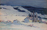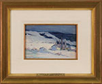 In 1919, Clarence Gagnon returned from Paris to the province of Quebec, settling in the village of Baie-Saint-Paul, nestled along the north shore of the St. Lawrence River in Charlevoix County. Infused with the aesthetic sensibilities of Impressionism, this captivating pochade imparts Gagnon’s refined vision to the Canadian landscape. Whether at dusk or daybreak, the diffused light across the iridescent snow and distant Laurentian Mountains evokes a quiet, liminal moment, conjuring a dreamy midwinter vignette. Traversing the terrain on skis in winter and on foot in summer, Gagnon developed an intimate connection to the rhythms and moods of the Laurentians. A preparatory sketch for his circa 1925 canvas Baie-Saint-Paul, Winter, this study foregrounds his fluid en plein air brushwork. Enlivening the scene is his singular palette, achieved by hand-grinding his own pigments imported from Paris. Here, swathes of white snow are infused with dappled bursts of soft pastel, while moody, muted shadows stretch across the forested hills beyond. At once atmospheric and evocative, this picturesque sketch exemplifies Gagnon’s keen sensitivity to the distinctive charm of the Charlevoix region.