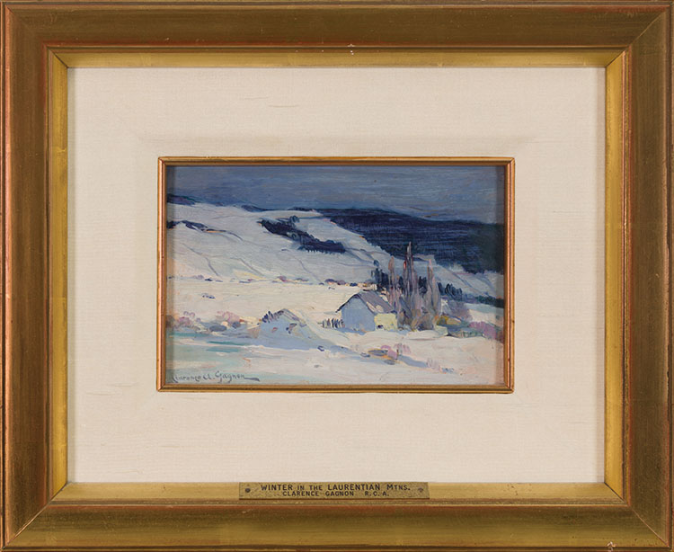 In 1919, Clarence Gagnon returned from Paris to the province of Quebec, settling in the village of Baie-Saint-Paul, nestled along the north shore of the St. Lawrence River in Charlevoix County. Infused with the aesthetic sensibilities of Impressionism, this captivating pochade imparts Gagnon’s refined vision to the Canadian landscape. Whether at dusk or daybreak, the diffused light across the iridescent snow and distant Laurentian Mountains evokes a quiet, liminal moment, conjuring a dreamy midwinter vignette. Traversing the terrain on skis in winter and on foot in summer, Gagnon developed an intimate connection to the rhythms and moods of the Laurentians. A preparatory sketch for his circa 1925 canvas Baie-Saint-Paul, Winter, this study foregrounds his fluid en plein air brushwork. Enlivening the scene is his singular palette, achieved by hand-grinding his own pigments imported from Paris. Here, swathes of white snow are infused with dappled bursts of soft pastel, while moody, muted shadows stretch across the forested hills beyond. At once atmospheric and evocative, this picturesque sketch exemplifies Gagnon’s keen sensitivity to the distinctive charm of the Charlevoix region.