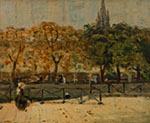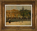 James Wilson Morrice’s View of the Seine, Paris exemplifies the artist’s celebrated Impressionist approach and his unique sensitivity to the subtle moods of place and atmosphere. Morrice, who in his lifetime became one of Canada’s most acclaimed international artists, captures the essence of Paris with deft, fluid brushwork and a delicately muted palette. In this intimate depiction of daily life along the riverbank, he captures figures strolling and seated beneath golden-hued trees in early autumn. In the distance, a Gothic spire, likely that of Notre-Dame, rises, lending structure and depth to the composition.