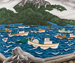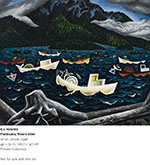 In 2001, Barbeau specifically asked Hughes to paint Fishboats, Rivers Inlet as a watercolour, and this resulted in a painting with a different mood. The 1946 oil, done immediately following Hughes’s war service, is dark and dramatic, the boats lit with a surrealistic glare. The presence of illuminated marker buoys and lanterns in the wheelhouse of many of the gillnetters shows this was a night scene. In the later watercolour, the rounded hillsides are thickly forested and the foreground tree trunks, formerly rim-lit with mystery, are now washed with the light of an overcast afternoon. About this painting Barbeau wrote: “This is a nimble piece of work. Whereas the oil painting is severe and somewhat ominous, the watercolour is bubbly and cheerful.”[1]