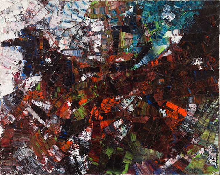 Today, Riopelle’s oeuvre is regarded by some art historians as among the most important of the second half of the twentieth century, far surpassing that of his contemporaries in Paris in the 1950s.[4] Over the course of his career, he garnered multiple prestigious accolades including the UNESCO prize at the Venice Biennale in 1962, followed by the Order of Canada in 1969. His work is held in important collections internationally, including the National Gallery of Canada, the Tate in London, the Art Institute of Chicago and the Peggy Guggenheim Collection in Venice.