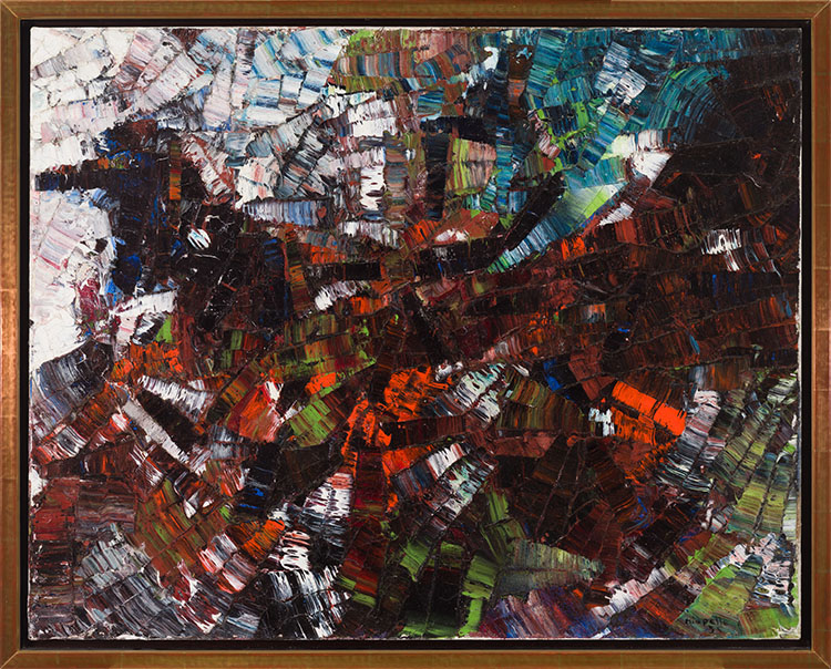 Today, Riopelle’s oeuvre is regarded by some art historians as among the most important of the second half of the twentieth century, far surpassing that of his contemporaries in Paris in the 1950s.[4] Over the course of his career, he garnered multiple prestigious accolades including the UNESCO prize at the Venice Biennale in 1962, followed by the Order of Canada in 1969. His work is held in important collections internationally, including the National Gallery of Canada, the Tate in London, the Art Institute of Chicago and the Peggy Guggenheim Collection in Venice.