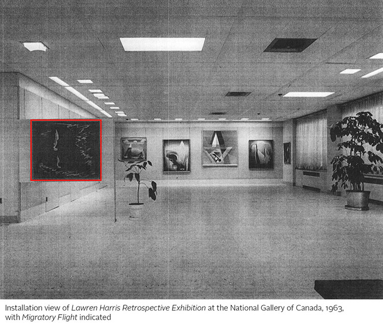 Musée des beaux-arts du Canada, Ottawa, exposition rétrospective Lawren Harris, du 7 juin au 8 septembre 1963, en tournée à la Vancouver Art Gallery, du 4 au 27 octobre 1963, intitulé A Migratory Flight, datée de 1954 - 1956, catalogue #62
