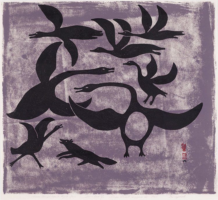 Kenojuak Ashevak was a pioneering artist in the Cape Dorset printmaking tradition, a movement that rose to prominence in the mid-20th century. She launched her career in the early 1960s and quickly become known for her masterful use of negative space. In Geese Frightened by a Fox, this technique is on full display, creating a dynamic sense of movement and energy. The print captures a moment of sudden chaos as a fox startles a group of geese, their bodies frozen in mid-motion. Ashevak’s thoughtful use of empty space guides the viewers eye through the scene, emphasizing the relationship between the animals and their surroundings. This balance between open and filled areas not only heightens the tension but also lends the image a sense of weightlessness – you can almost hear the beat of their wings as the geese take flight.