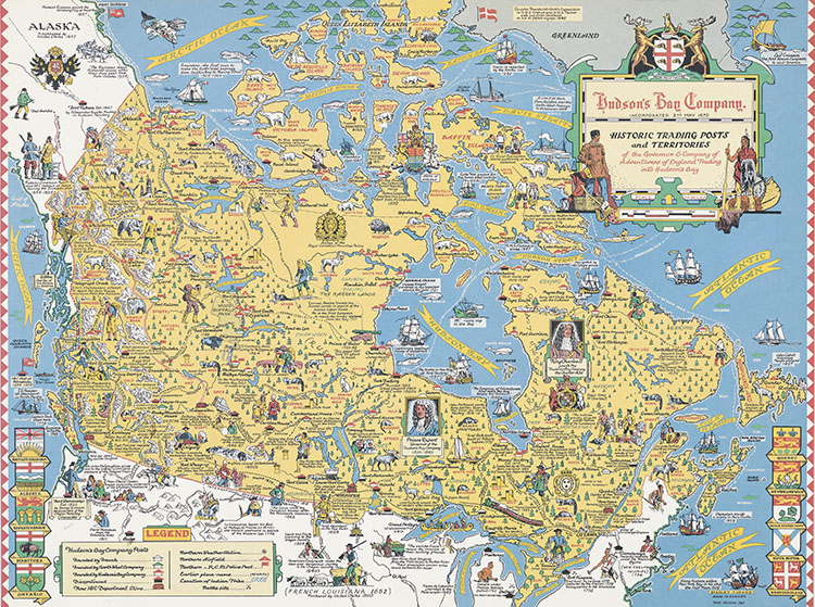 This is the third revision of Stanley Turner's map. The first, in 1939, and the second, in 1955, were used instead of a painting for the HBC calendar. This map is dated 1969 and was also featured on a linen tea towel. Each poster measures 19 1/4 x 25 1/2 inches. The Buyer is hereby advised to read fully the Priority Special Terms & Conditions of Business pertaining to the Hudson’s Bay Company series of online auction sales, as well as the Terms and Conditions of Business and our Catalogue Terms. The auction preview will be held at Heffel Toronto from January 19 - 23, by appointment only. The Buyer is responsible for ascertaining the condition of this lot. All items will be sold “as is.” Condition reports and additional images are not available. Please note that Heffel's standard Buyer's Premium applies to each lot in the Hudson’s Bay Company auction. The Buyer’s Premium is the amount paid by the Buyer to the Auction House on the purchase of a lot, which is calculated on the Hammer Price as follows: a rate of 25% of the Hammer Price of the Lot up to and including $25,000; plus 20% on the part of the Hammer Price over $25,000, plus applicable Sales Tax.The Buyer is responsible for all pickup and shipping costs and arrangements. All lots will be sold “as is, where is” and will be deemed as released in Ontario and HST will be applied.