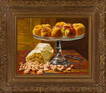 Nature morte au plateau de pêches et sac de noix
