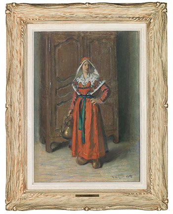 signed and on verso titled and inscribed "Cécile, Arthabaska, Qué. (niece of artist, dressed in Brittany Costume against old Brittany armoire)" and "33735"