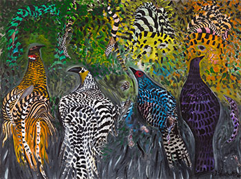 signed and dated 1982-1989 and on verso signed, titled on a label and titled "Birds Under A Tree" on verso and dated