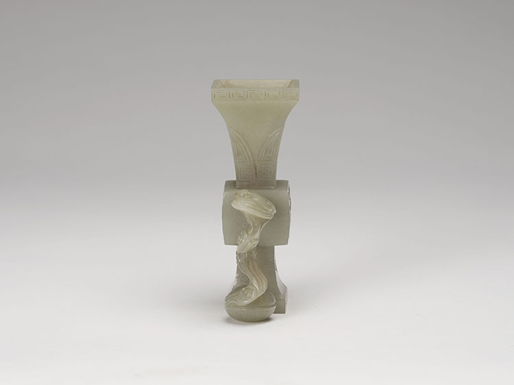 Of archaistic fang gu form, the squared central section slightly bulges and is carved with taotie masks in low relief, surmounted by a flaring neck and all supported on a spreading foot. Decorated with stylized lappets to the edges, all between keyfret borders at the rim and foot. Protruding from one side with a cloud-shaped handle supporting an auspicious bat, rising from a circular box. The polished stone of an even pale celadon tone.