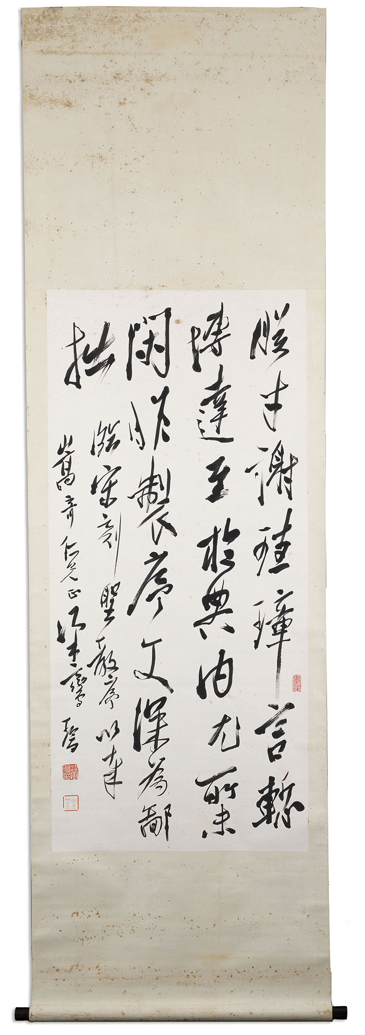 Ink on paper, mounted as a hanging scroll. Signed Liang Luancang, with a dedication to Wong Sung Kei and three seals of the artist, "Liang Luancang yin," "Zisheng" and "Hua jia san mei." Featuring a selection from the Song Dynasty stele of Sheng jiao xu in running script.Born in Canton, China, Wong Sung Ki moved to Hong Kong in his early years, where he established an import-export business. Residing in Causeway Bay, he built a significant collection of Chinese paintings, acquiring works directly from renowned 20th-century masters, including Huang Binhong and Pu Ru (1896–1963). A Huang Binhong handscroll from the family collection, Qushui zhi bin, was sold for HKD $2,300,000 at China Guardian, Hong Kong, in 2014.