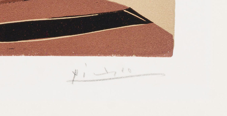 This wonderful 1959 Picasso linocut is signed and editioned 23/50 in graphite (total edition includes 20 artist’s proofs), on Arches wove paper, published in 1960 by Galerie Louise Leiris, Paris.