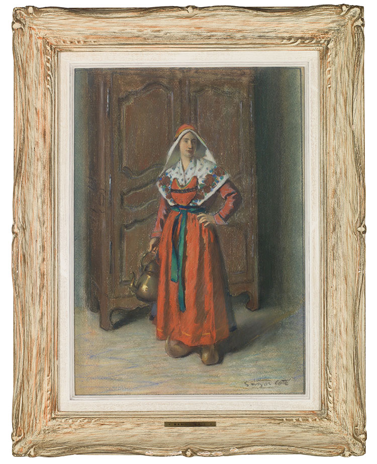 signed and on verso titled and inscribed "Cécile, Arthabaska, Qué. (niece of artist, dressed in Brittany Costume against old Brittany armoire)" and "33735"