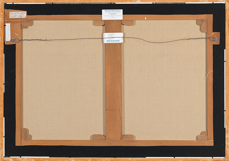 Sans titre is a medium-format matte work, an oil on paper on canvas, the result of Riopelle’s 1956 technical experimentation, initially painting with gouache on paper, the medium a thinner, more ductile material used by his partner at the time, the American painter Joan Mitchell. His works from this period, which came after his various Eskimo Mask paintings, were initially in black and white, before evolving towards muted, exploded colours (the Sous le mythe de Gitksan series) and then muted tones, as in his work Où sont les belles ombres (circa 1956).