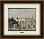 The painting presents a westward view that includes a black building behind the first house Milne rented upon arriving in Palgrave in 1930, with the Queen’s Hotel visible beyond it. Rendered with simplified forms, calligraphic line work, and a muted palette of blacks, browns, and soft greens, the composition reflects Milne’s distinctive synthesis of Impressionism and Fauvism. The off-white sky and flattened spatial relationships emphasize rhythm and balance over descriptive realism, a hallmark of Milne’s Palgrave paintings.