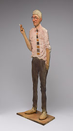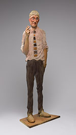 This bronze of internationally renowned British artist David Hockney is part of a series of artist portraits that Joe Fafard executed over decades. This image is based on the cover photo for Hockney’s 1993 book That’s the Way I See It, with Fafard using the artist’s same pose and the same clothes. Hockney’s stance is relaxed and informal, cigarette in hand, looking as if he is about to deliver a witty remark. His eyes are full of intelligence and awareness, and his smile conveys his sense of humour. The artist’s clothes reflect his sartorial sense. As Jake Gallagher wrote for Esquire,