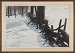 A deer is usually alert but in seclusion during the day. Here, one is seen gazing out over the open field where danger might threaten from the nearby farm or from the snowmobile whose track is just discernible. The glazed, nubby texture on top of the drifts in the foreground indicates there is a thick crust on the snow, strong enough to support the doe, so the elegant lines of her legs can be seen. The snow has drifted in behind the fence making curving shapes on which the abstract forms of the fence are reflected.