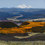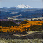 At their core, the artist’s landscapes are inspired by his memories of the geographies of central and western Canada and the United States, in particular the wide spaces of the Great Plains that encompass Saskatchewan and North Dakota, where he studied, and the prairies of Manitoba, where he remained most of his life. Because of this, mountains seem to hold a particular fascination for him, having first seen the Rockies rise out of the flatness of the horizon on a family trip in 1949. “Coming upon any mountain range fills me with a sense of anticipation and awe,” he wrote. “Amid such massiveness, I feel insignificant but simultaneously enlivened, for it’s as if entering the mountains will somehow alter my life.” Further trips followed to the Rockies and the American Northwest, where Eyre would derive inspiration from the hills, meadows, mountains and forests that make up those dramatic landscapes.